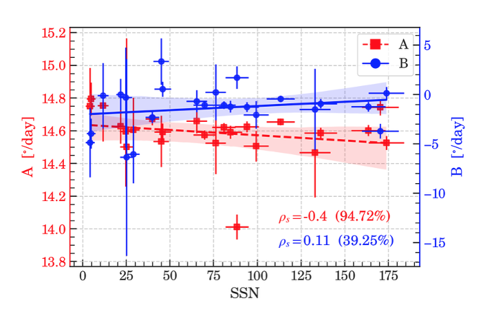 A weak negative correlation of the equatorial rotation rate (A) is also found with solar activity (Fig. 3), further agreeing with the fact that the differential rotation might undergo a phenomenon known as magnetic braking when solar activity increases.