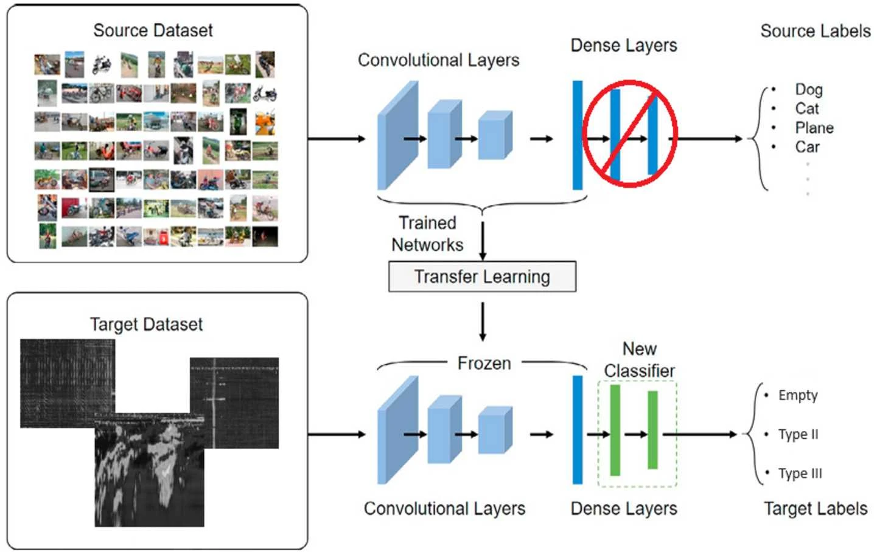 Figure 1. A diagram of the general architecture of transfer learning models, illustrating the frozen feature extraction layers and retrained dense layers, which have been adapted for this study (Tao et al. 2020).