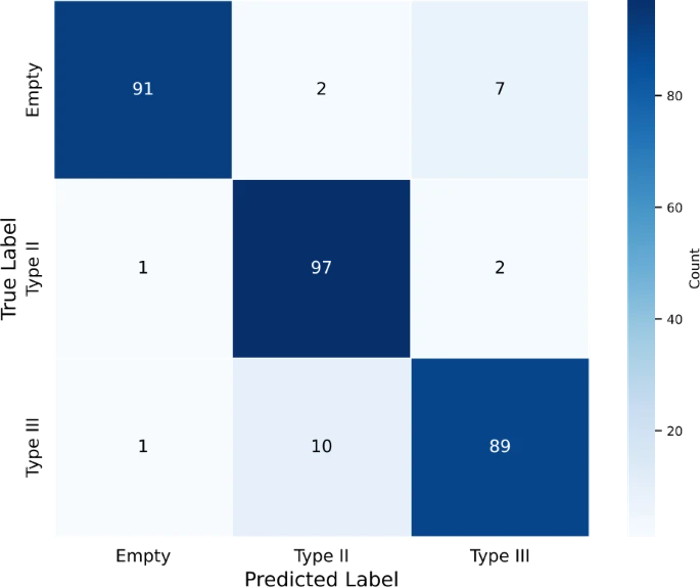Figure 2. Confusion matrix illustrating the distribution of classifications made by the best performing (YOLOv8) model. Values represent raw counts of predictions for each class (Empty, Type II and Type III), with rows as true labels and columns as predicted labels made by the model.